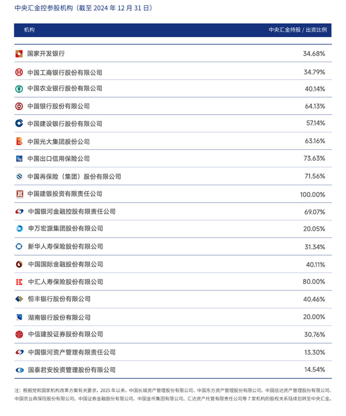 《报告》显示,截至2024年末,中央汇金直接持有19家控参股机构股权(包括银行、证券公司、保险公司及综合性金融机构)。