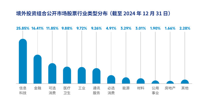 与此同时,《报告》还进一步披露了境外投资组合公开市场股票行业类型分布。其中,信息科技占比25.85%、金融占比16.41%、可选消费占比11.85%、医疗卫生占比9.88%、工业占比9.72%、通讯服务占比9.26%。